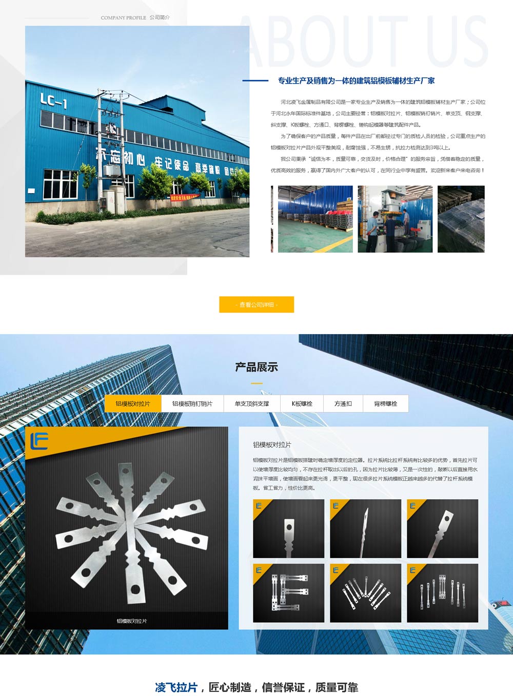 鋁模板對拉片、鋁模板銷釘銷片、單支頂、鋼支撐、斜支撐、K板螺栓、方通口、背楞螺栓、錘鉤起模器等建筑配件產品。 日期 :2019-07-17 09:34:38