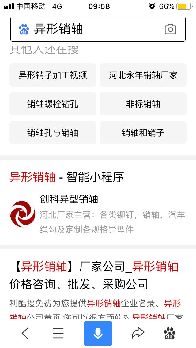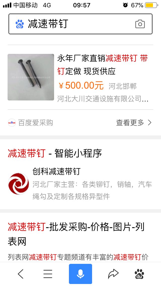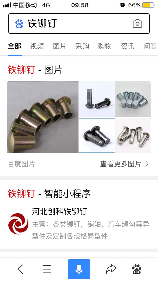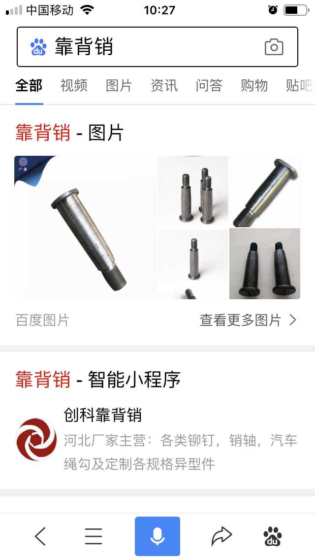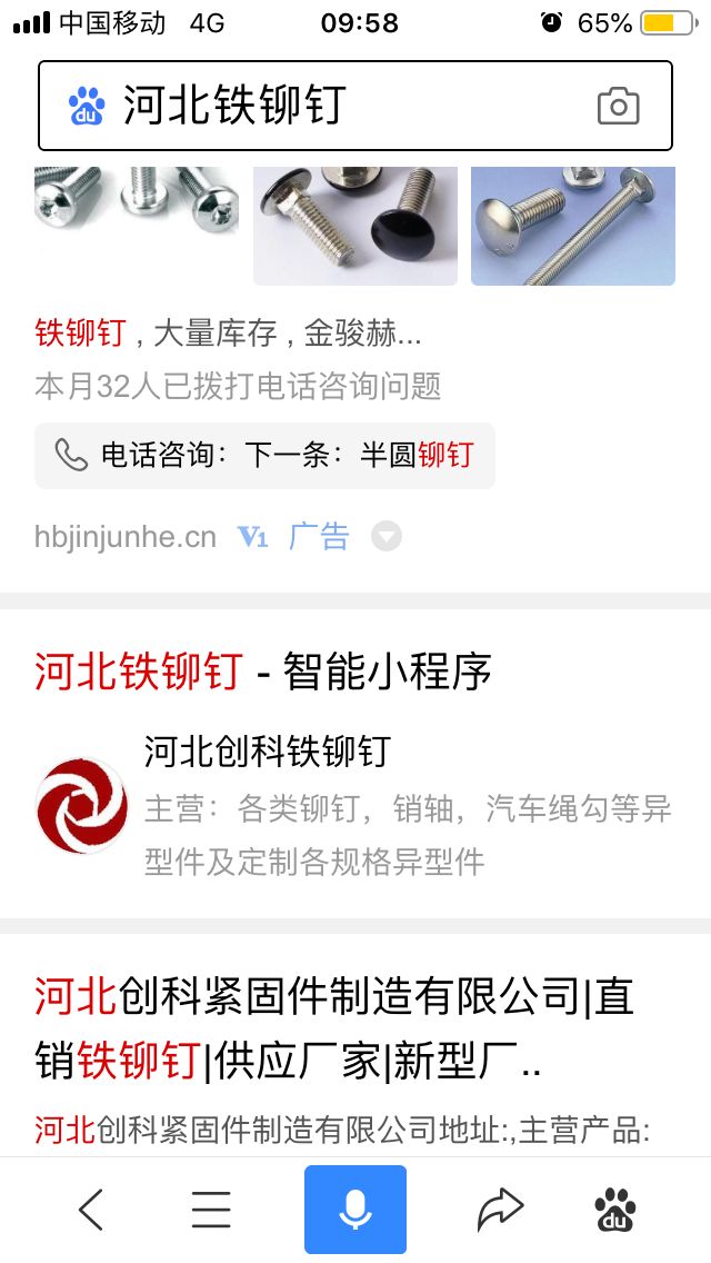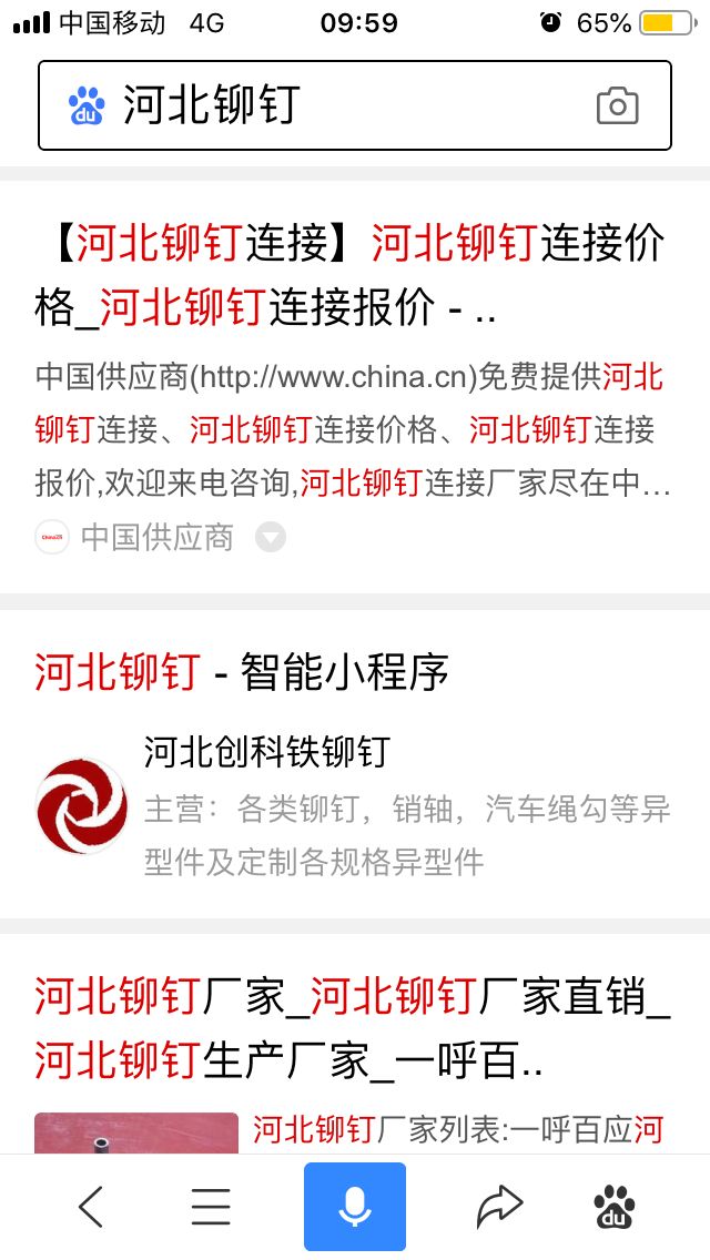 百度小程序:創(chuàng)科鉚釘、河北創(chuàng)科鐵鉚釘、河北創(chuàng)科銷軸、創(chuàng)科汽車?yán)K勾、創(chuàng)科靠背銷、創(chuàng)科減速帶釘、創(chuàng)科平頭鉚釘、創(chuàng)科開(kāi)口銷、創(chuàng)科異型銷軸